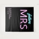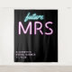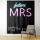 Superbe tapisserie de photobooth noire personnalisée "future Mrs" moderne pour votre enterrement de vie de jeune fille, avec "future" et "MRS" écrits en écriture teal bleue et rose chaud avec un effet néon. Vous pouvez personnaliser avec votre nom et la date de la fête. Le coin inférieur est laissé vide pour une zone pour que vos invités prennent des photos.