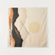 A serene minimalist landscape featuring layered mountain ranges under a large, soft-yellow sun. The composition uses a sophisticated earth-tone palette, transitioning from deep charcoal black and burnt orange in the foreground to hazy, translucent beige peaks in the distance. The clean lines and flat aesthetic evoke a sense of peace and modern simplicity, blending traditional Japanese "Sumi-e" influences with contemporary graphic design.
