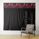 This wedding backdrop features a striking vertical layout with a bold contrast between a black background and an ornate side panel adorned with stylized skulls and floral elements in deep reds, pinks, and creams. The design blends gothic and romantic themes, creating a sophisticated and intriguing atmosphere perfect for a memorable celebration. Elegant typography highlights the names and date, adding a touch of formality to the overall aesthetic. Ideal for couples seeking a unique and dramatic setting, this backdrop combines detailed illustration with minimalist text placement for a visually captivating experience.