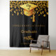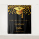 Un arrière - plan noir chic. Décoré de confettis dorés et d'un faux casquette d'or, casquette, dessus de table avec l'année à l'intérieur. Texte : Félicitations ! Le texte : Graduate, et le nom sont écrits avec un grand script de style écrit main moderne. Pour lui et elle. Une bannière, une décoration de fête, ou un stand photo, en toile de fond pour une fête de remise des diplômes 2025 (ou toute année).