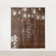 Le bois rustique de la grange et les guirlandes lumineuses mettent en valeur ce décor de photo pour les photos de vos invités. Le vieux bois rustique avec des lanternes en bocaux Mason suspendues et des lucioles avec un bocal Mason et un bouquet de fleurs éclairé dans le coin inférieur crée un cadre de style campagnard pour les photos de vos invités, ou comme une toile de fond idéale pour votre livre d'or de mariage, table à gâteau ou entrée de réception de mariage. 'Happily Ever After' écrit en calligraphie manuscrite avec les noms des mariés et la date du mariage dans un style contemporain moderne. Cela fait partie d'une collection de papeterie de mariage avec des accessoires de mariage assortis. Conception créée pour le BarefootBride™ © par WhimsicalArtwork™.