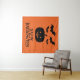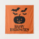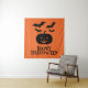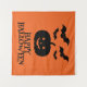 Illustration d'une silhouette noire de citrouille souriant et de chauves-souris volantes qui vous accueillent un Halloween heureux sur un arrière - plan orange. Une idée de cadeau pour les amateurs d'halloween, les amateurs éffrayants, les amateurs de chauves-souris et de films d'horreur.