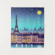 Un imaginaire stylisé de l'horizon parisien, sous un ciel bleu étoilé, avec une pleine lune