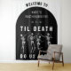 Définissez le ton d'une célébration à glacer le sang avec ce fond "Jusqu'à ce que la mort nous sépare". Le design présente des squelettes dansant à l'intérieur d'une arche de pierre tombale noire, donnant à votre enterrement de vie de jeune fille une ambiance sombre et gothique. C'est parfait pour les séances photo, ajoutant une touche ludique mais sinistre à la décoration. Idéal pour les futures mariées qui adoptent des thèmes sombres, audacieux ou inspirés d'Halloween.
