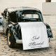 A custom "Just Married" and wedding names fabric car banner sign perfect for your wedding. This "Just Married" car banner sign used script calligraphy script perfect for any wedding. Use the words "Just Married" or customize them to suit your wedding. Order the size based on your vehicle.