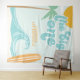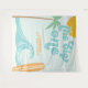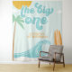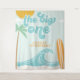 Fond pour le 1er anniversaire de The Big One Surfing Beach avec des vagues turquoise et une planche de surf orange.