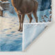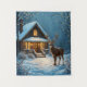 Magnifique cerf à 12 pointes par une soirée enneigée calme debout devant une maison en rondins avec de petites lumières scintillantes dans les arbres et un porche éclairé et accueillant.