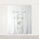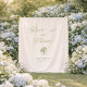 Tapisserie élégante de mariage «L'amour est en fleurs» avec des hydrangeas de couleur sage vert, avec des fleurs dessinées à la main et un style d'héritage doux. Parfait comme toile de fond pour les photos, les tables de dessert et les célébrations de jardin.