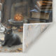 Le Fantôme d'Ember Hollow Tapestry d'Halloween avec citation poétique Niché dans une pièce rustique où les feuilles d'automne dérivent par la fenêtre, une figure fantomatique est assise tranquillement au coin du feu, enveloppée d'une feuille blanche et d'un silence doux. Le foyer en pierre brille de lumière aux chandelles et de chaleur, projetant des scintillements sur des livres anciens, des souvenirs encadrés et un seul citrouille sculpté. Un chat noir aux yeux brillants regarde de l'ombre, son regard constant et conscient. L'air s'emballe à la hush d'octobre, où confort et mystère s'entremêlent comme de la fumée.