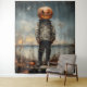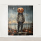 L'image représente un personnage debout dans un cadre extérieur, portant un costume militaire usé et robuste avec des bottes. Au lieu d'une tête, la figure a un grand citrouille sculpté au visage menaçant et brillant de jack-o-lanterne. Le ciel est couvert, donnant à la scène une atmosphère étrange, et le sol est parsemé de végétation sèche et de deux petits citrouilles, mettant l'accent sur le thème de l'Halloween. Le style de la peinture rappelle l'Americana classique, évoquant à la fois la nostalgie et le malaise.