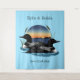 Une paire de huards sur le lac avec un coucher de soleil et des cattails derrière.