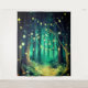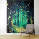 Une belle soirée pour un mariage, avec un chemin forestier orné de lumières féeriques dans les arbres créant une toile de fond époustouflante. Une brume légère flotte à l'arrière-plan de la forêt, avec d'innombrables arbres et lumières suspendues gracieusement à leurs branches.