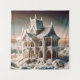 Une belle maison faite entièrement de coton doux, avec des détails architecturaux sophistiqués comme des arches, des colonnes et un toit à pignons. Le matériau cosy et onirique contraste avec le design précis, créant un mélange unique de douceur et d'élégance. Située dans un paysage serein, cette maison en coton est à la fois surréaliste et accueillante, avec des nuages de coton flottant au-dessus, complétant l'atmosphère paisible.