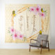 Tapisserie élégante et amusante pour la baby shower d'été. Fond jaune et blanc avec un motif en nid d'abeille. Avec un cadre géométrique en faux or. Décoré de fleurs tropicales roses, d'hibiscus et d'abeilles joyeuses. Avec le texte : Maman à devenir abeille et le nom de la future maman. Modèle pour le nom et la date. Peut être utilisé comme décoration murale pour la baby shower ou comme toile de fond pour les photos.