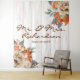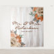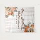 Fond de planches de bois de grange blanc rustique, avec un magnifique bouquet de fleurs en florales orange brûlé et crème avec des éléments botaniques verts poussiéreux dans les coins supérieur droit et inférieur gauche, typographie de script élégant pour le nom de famille personnalisé M. et Mme ; combiné avec une typographie serif pour une date personnalisable. C'est un design intemporel réalisé spécifiquement pour un mariage rustique ou une célébration d'anniversaire.