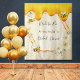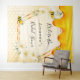 Tapisserie amusante pour une douche de mariage estivale. Fond jaune et blanc avec un motif en nid d'abeille. Avec un cadre géométrique en faux or. Décoré de fleurs tropicales jaune clair, crème, d'hibiscus et d'abeilles joyeuses et de miel doré qui coule. Avec le texte : Future mariée. Personnalisez et ajoutez le nom de la future mariée. Peut être utilisé comme décoration murale pour la douche de mariage ou comme toile de fond pour les photos.