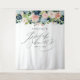 Cette élégante tenture de mariage fleurie constitue le fond parfait pour vos photos de douche. Le design chic présente des roses et de la verdure aquarelles rose blush et bleu marine et bleu clair peintes à la main sur un fond blanc avec votre nom et les mots "Mariage Élégant" en typographie script moderne avec la date de votre douche pour personnaliser ci-dessous. Conçu par Susan Coffey.