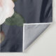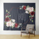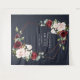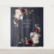 Moderne et tendance, ce magnifique design de tapisserie de mariage présente une fausse rose dorée cuivrée géométrique embellie de superbes roses bordeaux et roses aquarelles, de boutons et de verdure d'eucalyptus, sur un fond bleu nuit moderne. Copyright Elegant Invites, tous droits réservés.
