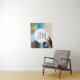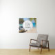 Une tapisserie de bienvenue de mariage avec une scène de plage tropicale idyllique. Eau cristalline turquoise bleue et plage de sable brun doux. Quelques feuilles de palmier pendent vers le bas depuis le haut. Un vieux bateau à rames en bois est sur la plage. Un paysage serein et paisible.