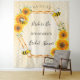 Tapisserie de fête de mariage élégante et amusante d'été. Fond jaune et blanc avec un motif en nid d'abeille. Avec un cadre géométrique en faux or. Décoré de tournesols aquarellés rustiques jaunes et orange et de bourdons joyeux. Avec le texte : Mariée à devenir et le nom de la mariée. Personnalisez et ajoutez le nom de la mariée et une date. Peut être utilisé comme décoration murale pour la fête de mariage ou comme toile de fond pour photos.