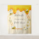 Tapisserie amusante pour une fête prénuptiale d'été. Fond jaune et blanc avec un motif en nid d'abeille. Avec un cadre géométrique en faux or. Décoré de fleurs tropicales jaune clair et crème, d'hibiscus et de joyeuses abeilles et de miel doré qui coule. Avec le texte : Future mariée. Personnalisez et ajoutez le nom de la future mariée. Peut être utilisé comme décoration murale pour la fête prénuptiale ou comme toile de fond pour photos.