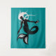 Tapisserie de sirène foncée avec une illustration numérique représentant une belle créature de mer noire - demi-poisson, figurine demi-femme avec peau noire, yeux brillants, cheveux blancs et belle queue frisée. Cette sirène bizarre a un collier de squelettes de poissons et de coquillages.