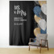 Un décor de douche nuptiale simple, moderne, élégant, formel et classe avec un titre "Ms to Mrs", avec un arc de ballons en blanc, or (pas de vrai papier) et denim (pas de vrai denim), script de calligraphie moderne et typographie en blanc. Un design chic et intemporel qui allie un design mariage traditionnel et formel à une calligraphie de script moderne et à une mise en page tendance.