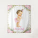 Fond de fête de bébé fille avec une adorable bébé fille portant un pantalon à volants rose et des perles sur un fond floral élégant rose et or. Ce fond de fête de bébé est facilement personnalisable avec le texte de votre choix. Vous pouvez également changer la couleur de fond.