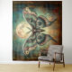 Un grand papillon de nuit avec des motifs complexes sur ses ailes est affiché en évidence sur un fond de pleine lune. Les ailes du papillon de nuit sont principalement turquoises et grises avec des touches de rose, tandis que la lune est jaune pâle. L'arrière - plan est orné d'un motif tourbillonnant dans des tons verts et bleus muets, qui rappelle le ciel nocturne. Le papillon de nuit lui-même a de multiples yeux sur ses ailes, créant une image mystique et captivante.