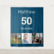 Pour une fête d'anniversaire des 50 ans (ou tout âge). Un collage de 3 de vos photos de ses amis, famille, centres d'intérêt ou animaux. Personnalisez et ajoutez son nom, âge 50 ans et une date. Fond bleu. Date de naissance ou date de la fête d'anniversaire. Texte de couleur blanche.