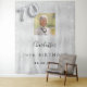 Une tapisserie de bienvenue pour une fête de 70e anniversaire glamour. Un fond métallisé argenté faux décoré de fausse poussière de paillettes. Personnalisez et ajoutez une photo de haute qualité, un nom et une date. Le numéro 70 est écrit avec une police de caractères de style ballon.