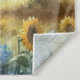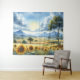 Cette tapisserie a un paysage aquarelle qui montre un champ avec des tournesols avec des arbres et des montagnes.