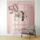 Une tapisserie pour une fête de 50e anniversaire girly et glamour. Un fond dégradé rose et or rose avec des gouttes de fausse brillance de couleur or rose élégantes, aspect de peinture qui coule. Personnalisez et ajoutez votre propre photo de haute qualité de la fêtée. Le texte : le nom est écrit en or rose foncé avec un style de lettrage manuscrit moderne avec des fioritures. Le numéro 50 est écrit avec une police de style ballon tendance. Pour conserver les fioritures, supprimez simplement le nom d'exemple, laissez les espaces ou les émojis devant et après le nom. Peut être utilisé comme bannière de bienvenue, décoration murale pour la fête ou comme toile de fond pour un photomaton.