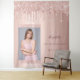 Une tapisserie pour une fête d'anniversaire de 16 ans girly et glamour, ou pour n'importe quel âge. Un fond dégradé rose gold avec des gouttes de paillettes de couleur rose gold élégantes et fausses. Ajoutez votre propre photo de haute qualité de la fille qui fête son anniversaire. Paillettes rose gold en guise de cadre. Le texte : Le nom est écrit en rose gold foncé avec un style de lettrage à la main moderne. Modèles pour un nom, un âge 16 ans et une date. Peut être utilisé comme décoration murale pour la fête ou comme toile de fond pour les photos.