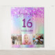 Pour un Sweet 16, fête des 16 ans. Un collage de 3 de vos photos d'elle, amis, famille, centres d'intérêt ou animaux de compagnie. Un fond de couleur holographique arc-en-ciel en violet, rose, or rose et vert menthe. Décoré de paillettes fausses violettes. Personnalisez et ajoutez son nom, âge 16 ans et une date. Date de naissance ou date de la fête d'anniversaire. Texte de couleur violette. Parfait pour une fête surprise ! Utilisez comme bannière de bienvenue, décoration murale ou comme toile de fond pour photomaton.