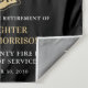 Cette conception comprend un drapeau de pompier avec des rayures noires et blanches, ainsi qu'une fine bande rouge. "Félicitations" et l'insigne d'un pompier est au-dessus de tous les détails du parti pour le pompier, lieutenant ou parti de retraite du chef qui prend sa retraite.