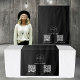 Tapisserie imprimée sur mesure qui peut être customisée à un coureur de table pour votre boutique pop-up. Customisez le coureur de table noir avec votre logo d'entreprise, 2 codes qr et du texte et créez votre propre coureur de table pour vos foires artisanales et événements de vendeurs. Parfait pour les salons, les pop-up, les expositions etc. Customisez l'un des codes QR pour votre site web ou boutique et l'autre à vos médias sociaux.