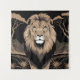 Vintage Lion Portrait, ce design présente une illustration vintage d'un portrait d'un lion à l'aspect calme et supérieur. L'arrière - plan est un paysage safari noir et blanc avec des arbres et des montagnes. L'ensemble est de style art déco.