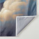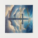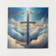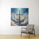 Croix bleue parmi les nuages avec design typographique doré.