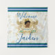 Adorable prince africain portant une couronne d'or sur un blason de lion doré élégant. Bordure rayée polo en haut et en bas du fond. Monogramme personnalisé élégant script Idéal pour Baby Shower ou Anniversaire du prince royal ©2021 Miss Sassy Party Designs