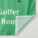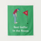 Golfeur, portant un casquette, chemise rouge profonde et pantalon bleu, mettant une balle de golf dans un design de pierre de trou. Ajoutez votre propre texte.