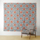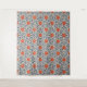 Seamless floral pattern with vibrant orange flowers and navy blue leaves on a beige background, creating an ornate, symmetrical design.