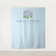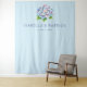 This elegant wedding backdrop features a delicate floral illustration of hydrangeas in soft pastel shades of blue and pink, surrounded by green leaves. The design is set against a serene pale blue background, creating a tranquil and sophisticated atmosphere. Below the flowers, modern sans-serif typography adds a clean touch to the layout, making it perfect for celebrating your special day. The minimalist aesthetic with ample negative space ensures that this backdrop will be both eye-catching and timeless, ideal for capturing beautiful memories on your wedding day.
