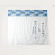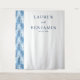 This wedding backdrop features a minimalist design with a split layout, combining a vertical band of stylized pine trees in shades of blue and white on the left, creating a wintery feel. The right side is a clean white space with elegant serif typography for names and date, accented by a script font for "and," offering a modern yet classic look. The cool color palette and natural motifs evoke serenity and anticipation, perfect for an elegant winter-themed celebration.