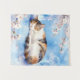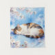 A peaceful scene of a calico cat curled up in a gentle slumber, with dreamy, translucent cherry blossom trees and petals floating ethereally above it, symbolizing sweet dreams of spring.