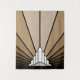 Un motif de style art déco classique créé dans le bronzage. Un motif emblématique du soleil se levant derrière un bâtiment en forme d'art déco stylisé. Un design simple mais élégant, fidèle à l'époque