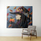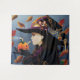 Jolie sorcière brune tout habillée en orange, violet et noir. Deux amis avec elle... une petite souris et un bébé citrouille qui la regardent de plus près. Les feuilles d'automne tombent tout autour d'eux.