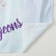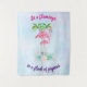 Tapisserie murale avec un dicton mignon : Soyez un flamant dans un troupeau de pigeons. Conçu avec l'illustration d'une maman et d'un bébé flamant rose debout sur un lit de fleurs florales succulentes avec des palmiers verts se balançant dans le dos. Tropical et joli. L'arrière - plan est une aquarelle d'été bleu clair avec des touches de violet.