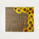 Extra large fabric backdrop with sunflowers and brown wood design. Personalize with names and date of wedding at the top. Bunches of yellow sunflowers make a partial border up the left side and along the top. Use as a backdrop for guests to take photos, or as a backdrop for a buffet, or dessert, table. Smaller sizes are also available.
