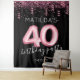 Toile de fond personnalisée pour une fête de 40e anniversaire avec un fond noir tendance, paillettes roses et confettis, 40 ballons roses, leur nom et date.